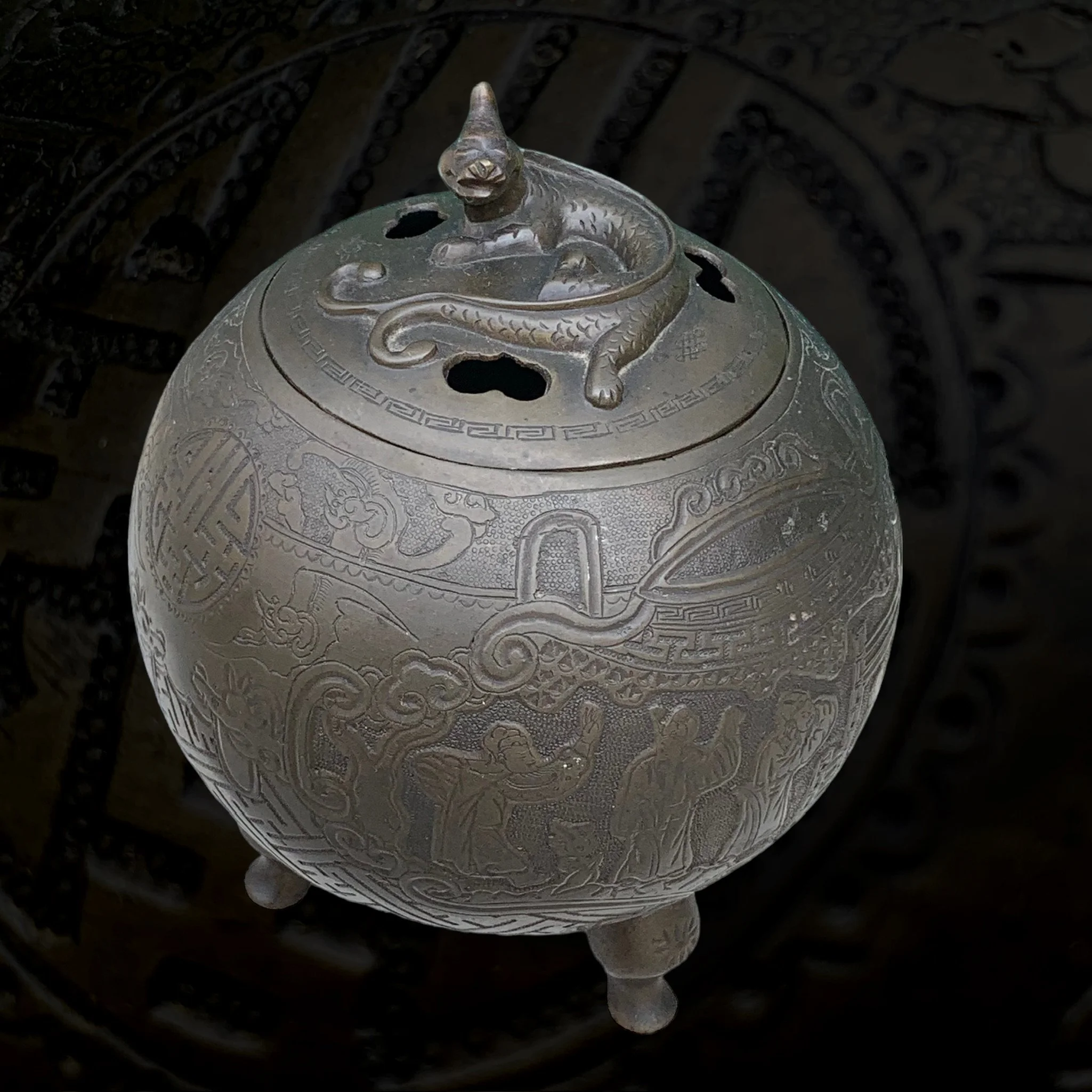 A circular bronze perfume burner, finely chiseled
