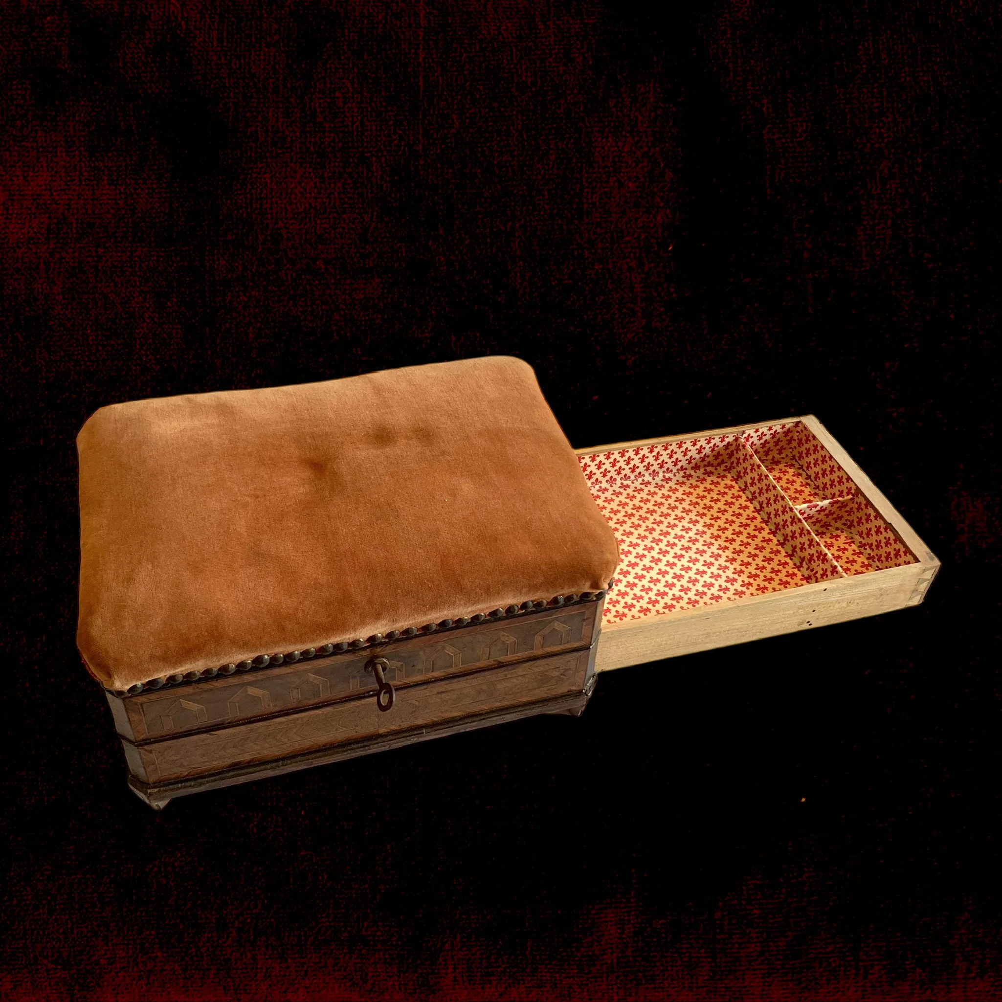 A very fine marquetry box, the top covered with velvet, with a drawer and some compartments inside.
