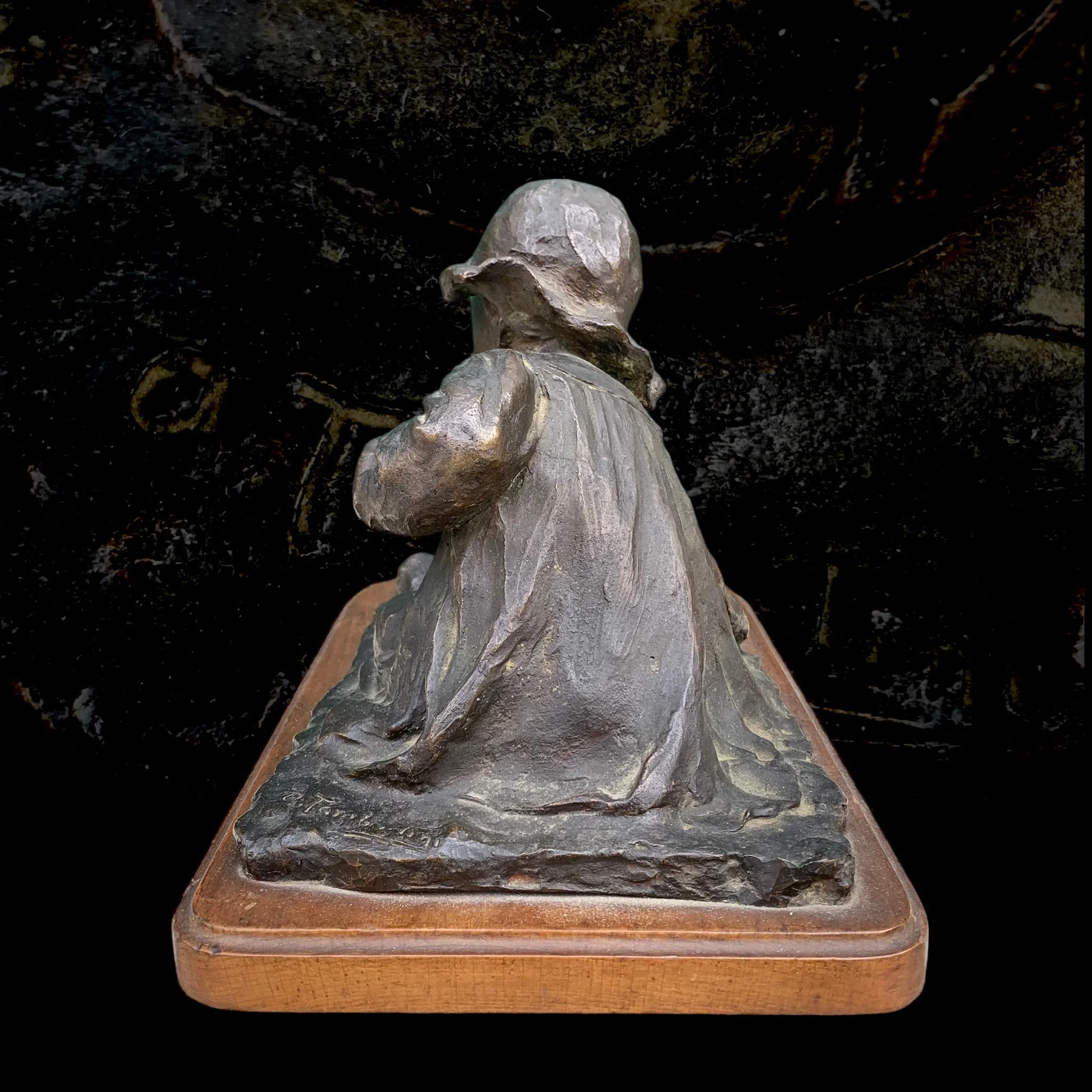 Bronze statue of a little girl sitting on a wooden base playing with a ball, signed Achille Tamburlini (Trieste 1873 - Roma 1958), late XIX century.