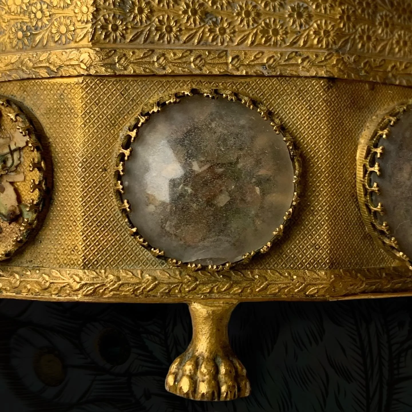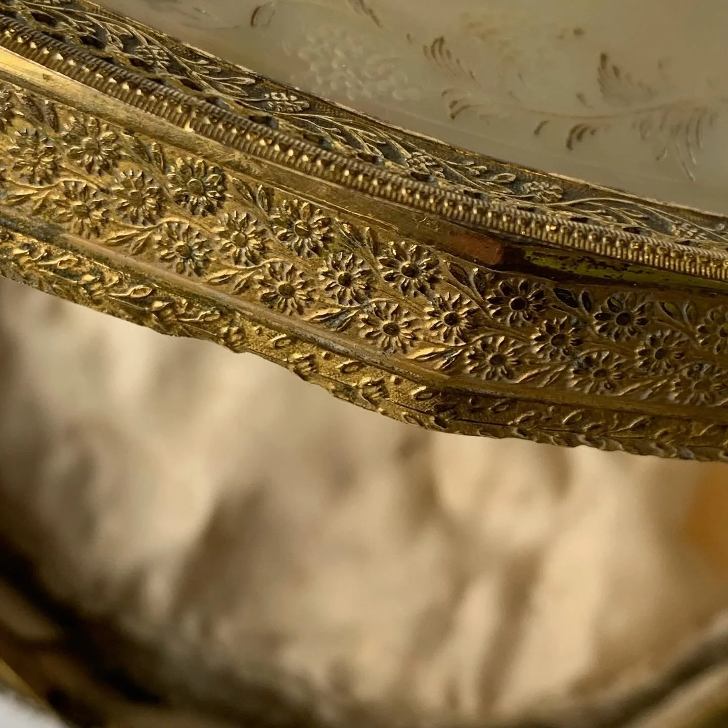 Engraved mother-of-pearl and bronze shell in the shape of a necessaire casket.